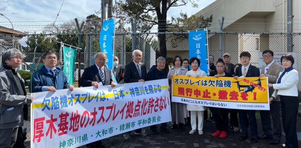 国会・活動報告 活動報告 2024年3月29日 平和・基地問題 米海軍厚木基地に対し、オスプレイの飛行再開に抗議 3月29日、米海軍厚木基地に対し、オスプレイの飛行再開に抗議し、厚木基地周辺をはじめオスプレイ飛行中止、撤去を求めて申し入れました。 日本共産党県委員会、各地方議員団とともに厚木基地を訪れ、屋久島沖の墜落事故原因の公表など求めました。 県、大和市、綾瀬市各平和委員会も申し入れました。 このページをシェア