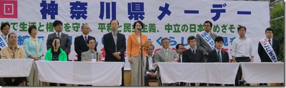 メーデーの1日、各地で集会・デモ行進に多くの人々が参加し、「消費税増税反対」「ТPP参加許すな」「原発再稼働やめ、原発ゼロの日本を」「大震災被災者救済を」と訴えました。志位和夫委員長先頭(東京代々木公園)に、はたの君枝南関東ブロック比例予定者、各地域の小選挙区予定者も参加しました。