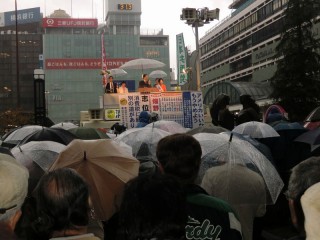 翌17日は志位和夫委員長が横浜駅西口に。大雨にもかかわらず2000人以上が参加しました。はたの君枝衆院比例南関東ブロック予定者は、この間の活動から市民県民のみなさんの声を力に「何としても南関東から志位委員長とともに2議席以上実現する事は皆さんへの責任」と必勝の決意を力強く述べました。