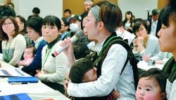 「保育園落ちた」という父母らが乳児を抱いて次々と思いをぶつけました。4カ月の長女が保育園に入れなかったという女性は「認可外にも電話をかけまくったが60~100人待ちと言われた。どうしたらいいか分からず、絶望で母乳が止まった」と発言。